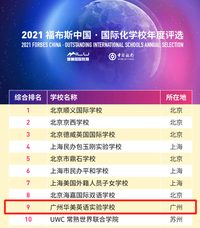 2021年5月18日,福布斯中国发布“国际化学校年度评选”结果,广州华美英语学校排名全国第...