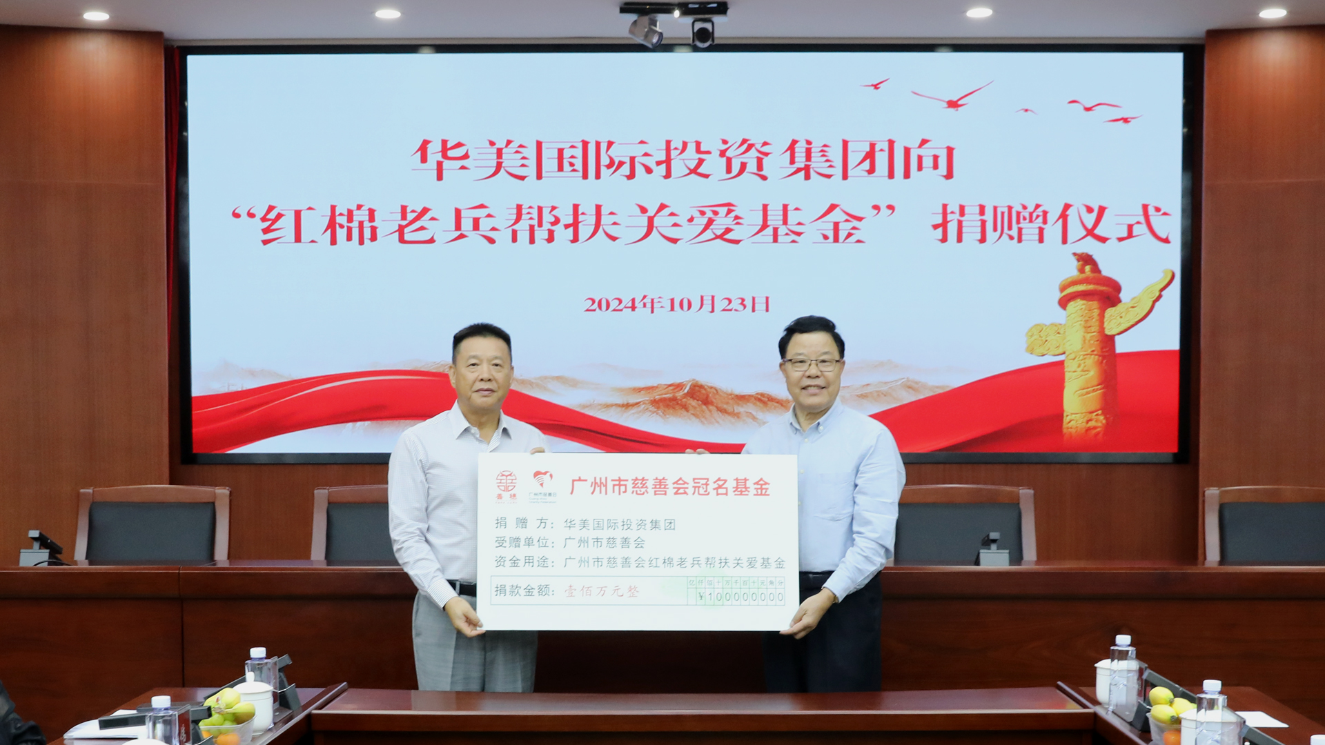 10月23日,广州市退役军人事务局举办华美国际投资集团向“广州市慈善会红棉老兵帮扶关...